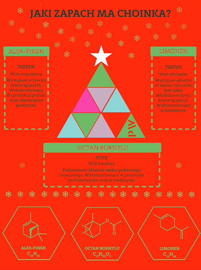 Wydarzeniu towarzyszy świąteczna iluminacja Gmachu Głównego w oprawie bożonarodzeniowych drzewek. Czym bowiem byłyby Święta bez zapachu choinki albo świeżych mandarynek? Zapach Świąt to przede wszystkim terpeny, czyli związki organiczne pochodzenia naturalnego o ogólnym wzorze (C5H8)n. To właśnie one odpowiadają za zapach, czy też właściwości lecznicze wielu naturalnych olejków. To, co czujemy siedząc obok jodły czy świerku to głównie alfa-pinen, monoterpen, pojawiający się w dużej ilości w żywicy drzew iglastych. Związek ten występuje w postaci dwóch izomerów, bardziej „europejskiego” (-)-α-pinenu oraz północnoamerykańskiego (+)-α-pinenu.